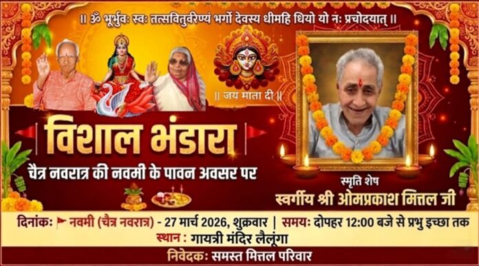 लैलूंगा नगर एक बार फिर भक्ति और श्रद्धा के रंग में रंगने जा रहा है। चैत्र नवरात्र की पावन नवमी तिथि पर मित्तल परिवार द्वारा एक भव्य और विशाल भंडारे का आयोजन किया जा रहा है, जो क्षेत्र में आस्था और सेवा का अद्भुत उदाहरण बनेगा। यह आयोजन स्वर्गीय ओमप्रकाश मित्तल की पावन स्मृति में रखा गया है, जिससे पूरे नगर में भावुकता और श्रद्धा का माहौल बना हुआ है।