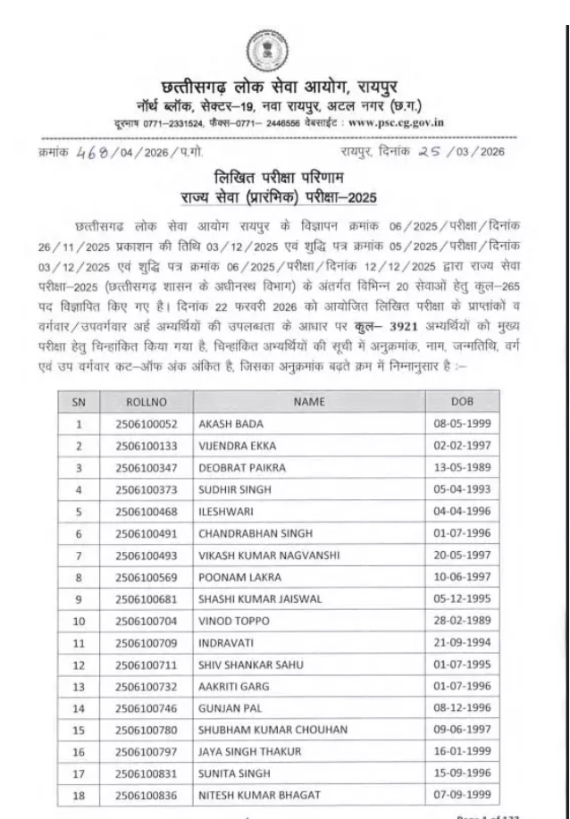 रायपुर। छत्तीसगढ़ लोक सेवा आयोग ने राज्य सेवा परीक्षा 2025 की प्रारंभिक परीक्षा का नतीजा जारी कर दिया है। इस परीक्षा में शामिल हुए उम्मीदवार अब आसानी से आयोग की आधिकारिक वेबसाइट psc.cg.gov.in पर जाकर अपना परिणाम देख सकते हैं। इस बार कुल 3921 अभ्यर्थियों ने प्रीलिम्स क्लियर किया है और अब ये सभी उम्मीदवार अगले चरण यानी मेंस परीक्षा में शामिल होंगे। आपको बता दें कि इस बार कुल 3921 अभ्यर्थियों ने प्रीलिम्स क्लियर किया है और अब ये सभी उम्मीदवार मेंस परीक्षा में शामिल होंगे। अयोग ने मेंस परीक्षा की तारीखें भी तय कर दी है। आयोग के अनुसार, यह परीक्षा 16 मई से 19 मई के बीच आयोजित की जाएगी।राज्य सेवा प्रारंभिक (Prelims) परीक्षा 2025 का रिजल्ट, जिसमें अभ्यर्थी का रोल नंबर, जन्मतिथि के साथ वर्ग, कट ऑफ अंक आयोग की अधिकृत वेबसाइट www.psc.cg.gov.in पर अपलोड कर दिए गए हैं। अभ्यर्थी पीडीएफ फाइल डाउनलोड करके उसमें अपना रोल नंबर खोज सकते हैं।