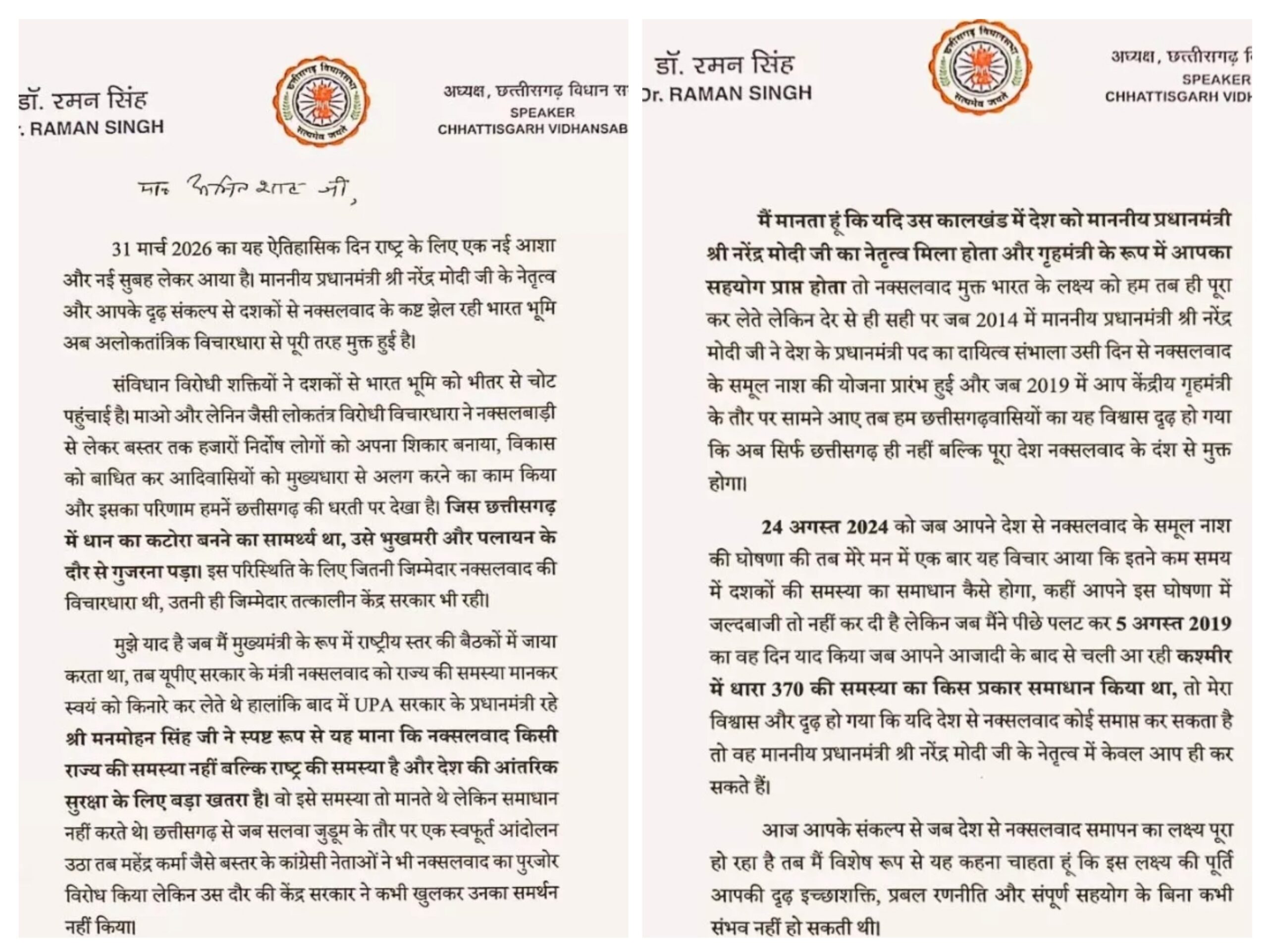 रायपुर। वर्तमान विस अध्यक्ष और पूर्व सीएम रमन सिंह ने केंद्रीय गृहमंत्री अमित शाह को पत्र लिखकर भारत से नक्सलवाद की मुक्ति पर आभार जताया है, रमन सिंह ने अपने पत्र में लिखा, हर असंभव कार्य को संभव करने वाले “साध्य पुरुष” केंद्रीय गृहमंत्री अमित शाह ने भारत माता को नक्सलवाद की पीड़ा से मुक्ति दिलाकर राष्ट्र की सुरक्षा को चारों ओर से सुदृढ़ करने का अद्भुत कार्य किया है। अमित शाह को पत्र लिखकर भारत से नक्सलवाद की मुक्ति पर उनका आभार प्रकट किया। अब छत्तीसगढ़ समेत पूरा देश नक्सलवाद जैसी लोकतंत्र विरोधी विचारधारा से मुक्त होकर प्रधानमंत्री मोदी के नेतृत्व में विकास की नव बयार से जुड़ेगा।