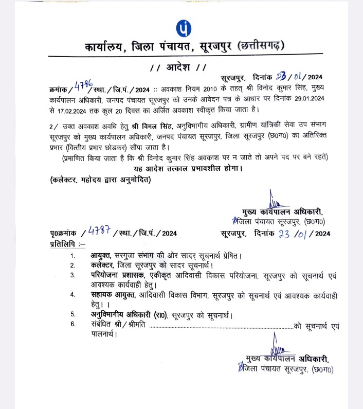 प्रदीप मिश्रा/सूरजपुर : सूरजपुर जिला पंचायत मुख्य कार्यपालन अधिकारी के द्वारा मनमानी तरीके से अधिकारियों को प्रभार दिया जा रहा है उनके द्वारा प्रभार देते समय शासन के नियमों एवं आदेशों का सरासर उल्लंघ सीन किया जा रहा है ताजा मामला सूरजपुर जिले के जनपद पंचायत सूरजपुर का है जहां पर वर्तमान सदस्य मुख्य कार्यपालन अधिकारी विनोद सिंह दिनांक 29.01.2024 से लेकर 17.02.2024 तक के लिए शासकीय अवकाश पर जा रहे हैं इस दरमियान शासन का आदेश है कि उनकी अनुपस्थिति या अवकाश पर जाने पर कार्यालय में पदस्थ वरिष्ठ विस्तार अधिकारी को ही पदभार दिया जाता चाहिए।