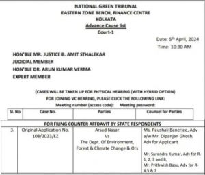 जिले के चर्चित सामाजिक कार्यकर्ता सह पर्यावरण प्रेमी सैयद अहमद नसर द्वारा टाटी नदी व सरकारी सड़क किनारे लगे पेड़ों को बिना अनुमति के काटने को लेकर एनजीटी पुर्वी जोन कोलकाता में दायर याचिका संख्या-108/2023 की सुनवाई आज एनजीटी में होगी.सुनवाई में भाग लेने के लिए अरशद भी कोलकाता पहुँच गए हैं.इस सुनवाई पर सभी की नजरें टिकी हुई है.