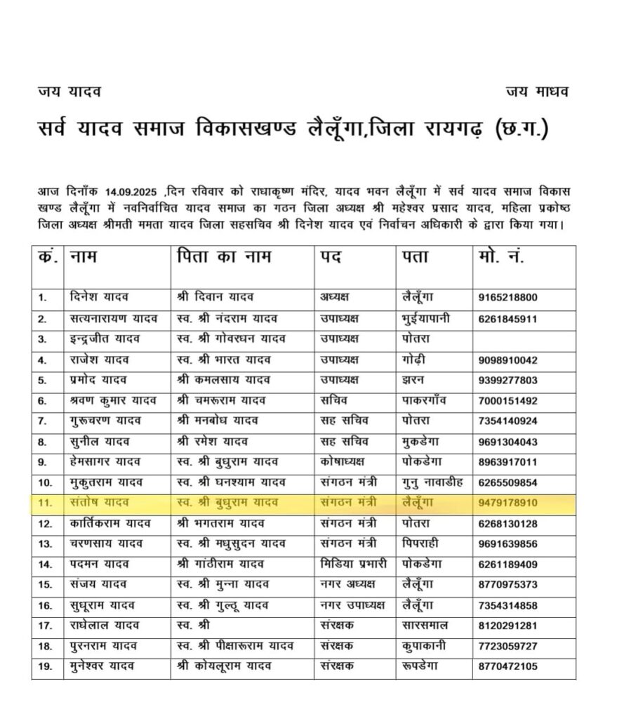 🔹 संगठन मंत्री – मुकुंतराम यादव, संतोष यादव, कार्तिकराम यादव, चरणसाय यादव