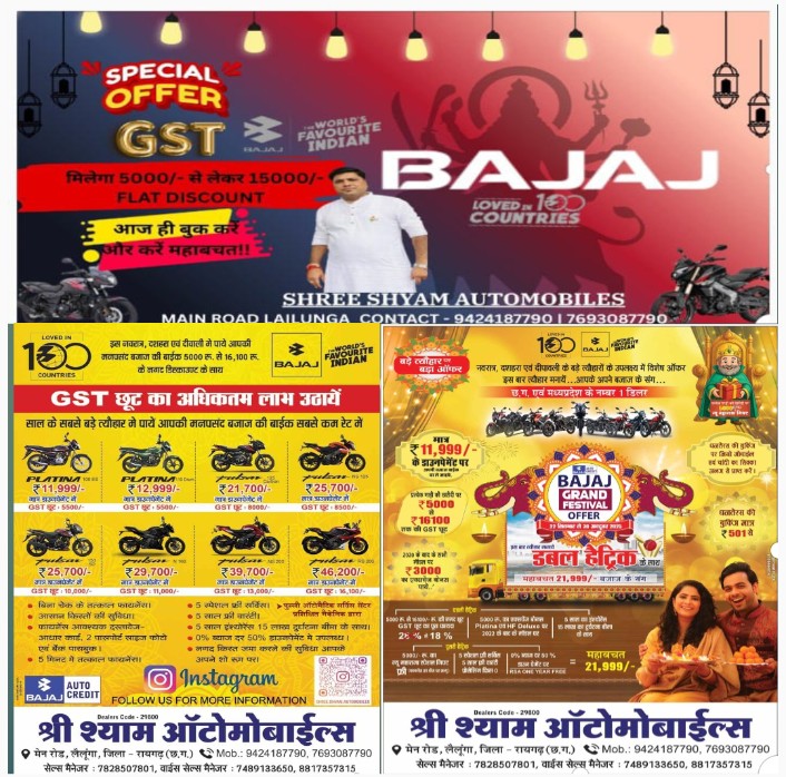 रायगढ़ जिला मुख्यालय से सटे लैलूंगा कस्बे में त्योहारों की रौनक अब और भी खास हो गई है। कारण है—श्री श्याम ऑटोमोबाइल्स लैलूंगा का जबरदस्त धमाका ऑफर, जो इस बार नवरात्रि और दशहरा पर्व पर ग्राहकों को गाड़ियों की खरीद के साथ “डबल फायदा” देने वाला है। बजाज के टू-व्हीलर चाहने वालों के लिए यह मौका किसी सुनहरे अवसर से कम नहीं है।