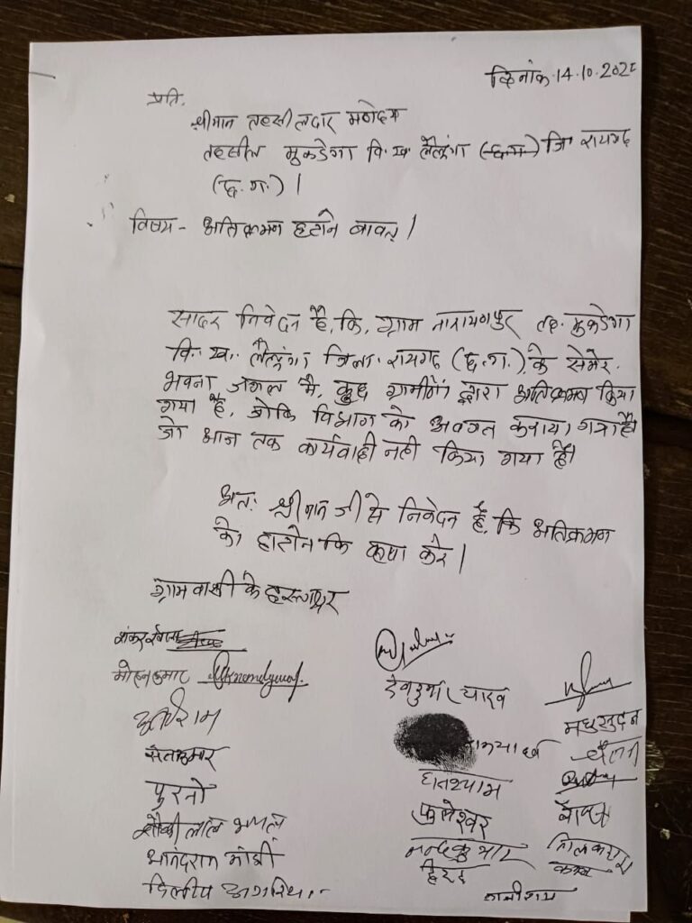 लैलूंगा। तहसील मुकडेगा के अंतर्गत ग्राम नारायणपुर के भवना जंगल में अवैध कब्जे का मामला दिनोंदिन तूल पकड़ता जा रहा है। ग्रामीणों द्वारा सरकारी जमीन जो कि गाँव का निस्तारी का जमीन है ,जो कि वन क्षेत्र में खुलेआम अतिक्रमण कर मकान, बाड़ और खेत तैयार कर दिए गए हैं — लेकिन हैरानी की बात यह है कि पटवारी और वन विभाग दोनों को जानकारी होने के बावजूद आज तक कोई कार्यवाही नहीं की गई।