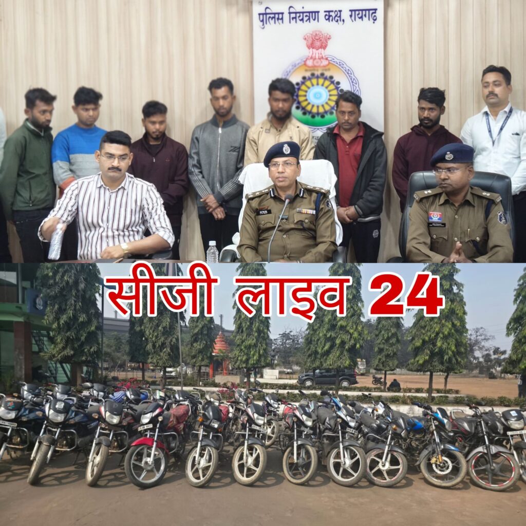 रायगढ़ पुलिस — बाइक चोरी कर फर्जी दस्तावेजों से बिक्री करने वाले बड़े गिरोह का पर्दाफाश, 7 आरोपी गिरफ्तार, 25 बाइक बरामद