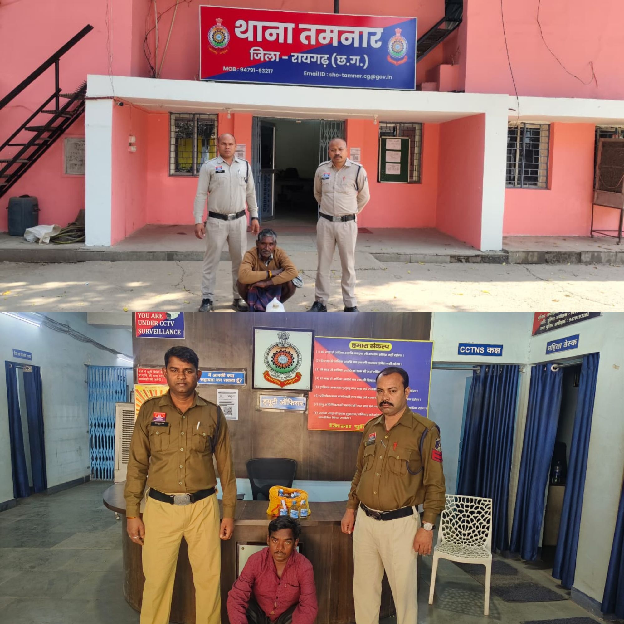 तमनार थाना क्षेत्र में थाना प्रभारी कमला पुसाम ठाकुर, सहायक उप निरीक्षक सुरीत लाल सिदार द्वारा ग्राम बागबाडी, बुडिया एवं सारसमाल क्षेत्र में पेट्रोलिंग पर थे। इस दौरान मुखबिर सूचना पर ग्राम सारसमाल में दशाई भगत (67 वर्ष) निवासी सारसमाल को पकड़ा गया। आरोपी के कब्जे से 09 लीटर हाथ भट्ठी कच्ची महुआ शराब, अनुमानित कीमत 1,800 रुपये तथा बिक्री रकम 150 रुपये जप्त की गई।