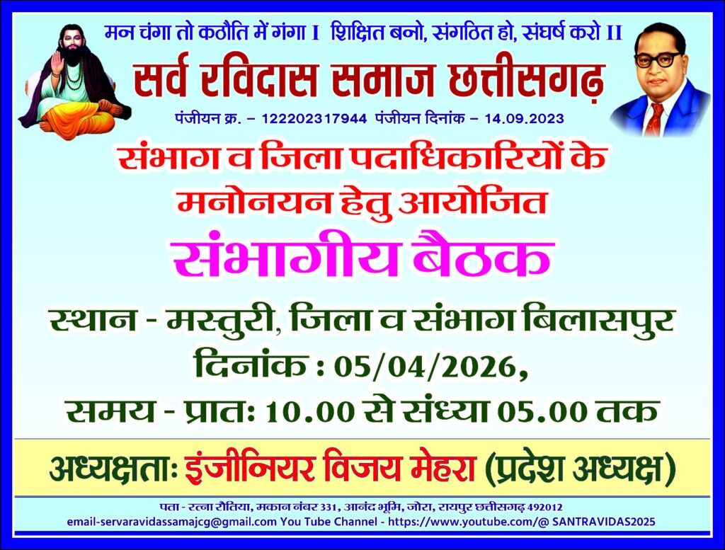सर्व रविदास समाज छत्तीसगढ़ के तत्वावधान में 5 अप्रैल 2026, रविवार को बिलासपुर संभाग स्तरीय महत्वपूर्ण बैठक का आयोजन किया जा रहा है। यह बैठक ग्राम मस्तुरी में प्रदेश अध्यक्ष इंजीनियर विजय मेहरा के निवास स्थान, भारतीय स्टेट बैंक मस्तुरी के सामने, सुबह 10:00 बजे से संध्या 5:00 बजे तक आयोजित होगी।