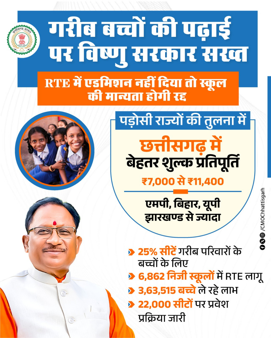 रायपुर: छत्तीसगढ़ में निःशुल्क एवं अनिवार्य बाल शिक्षा का अधिकार अधिनियम (RTE) 2009, अप्रैल 2010 से प्रभावी है। इसके अंतर्गत प्रदेश के गैर-अनुदान प्राप्त अशासकीय विद्यालयों की प्रारंभिक कक्षाओं में 25 प्रतिशत सीटें आरक्षित की गई हैं। इन सीटों पर आर्थिक रूप से कमजोर, दुर्बल वर्ग और वंचित समूह के बच्चों को उनके निवास क्षेत्र के भीतर प्रवेश दिलाया जाता है। मुख्यमंत्री श्री विष्णु देव साय के नेतृत्व में राज्य सरकार गरीब बच्चों की शिक्षा के प्रति पूरी तरह संवेदनशील है और सभी के लिए शिक्षा सुनिश्चित करने हेतु विशेष प्रयास किए जा रहे हैं।