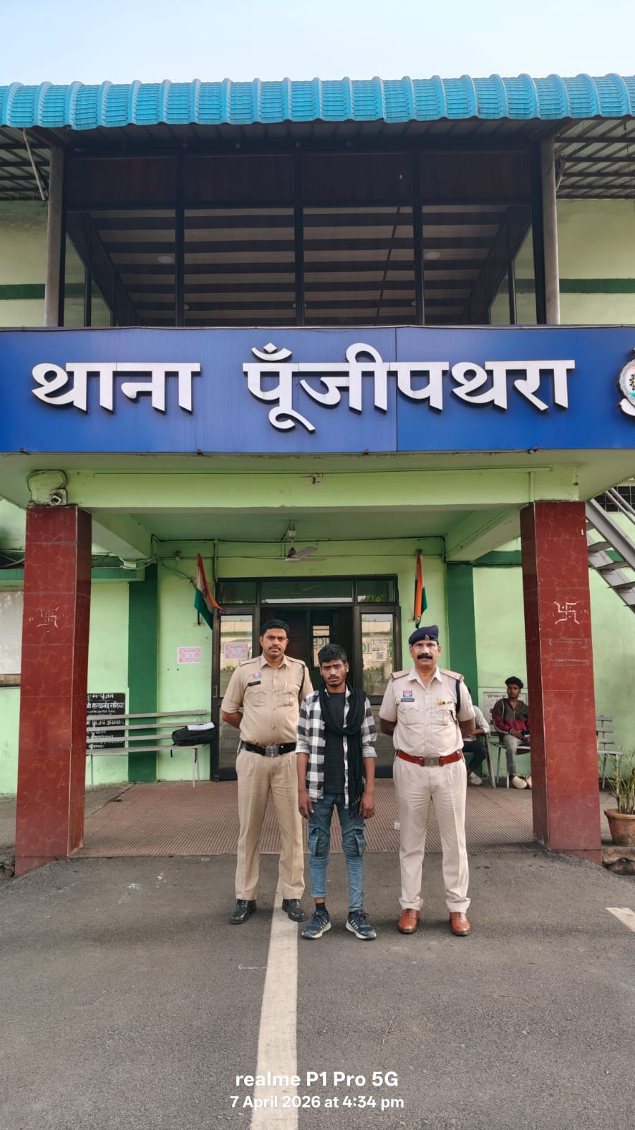 दूसरे मामले में थाना पूंजीपथरा में दिनांक 25.03.2026 को एक प्रार्थी ने अपनी 15 वर्षीय पुत्री के 17 मार्च की रात घर से बिना बताए लापता होने की रिपोर्ट दर्ज कराई थी। पुलिस ने अज्ञात आरोपी के विरुद्ध अपराध कमांक 49/25 धारा 137(2) बीएनएस के तहत  दर्ज कर पतासाजी शुरू की। जांच के दौरान दिनांक 06.04.2026 को अंबिकापुर के खरसिंया नाका चौक के पास एक युवक के साथ नाबालिग बालिका को बरामद किया गया। पीड़िता का महिला पुलिस अधिकारी द्वारा कथन कराया गया, जिसमें बालिका द्वारा बस से जामगांव फिर अम्बिकापुर ले जाना और शारीरिक संबंध बनाना बताई है । बालिका के कथन, मेडिकल पर आरोपी के विरुद्ध धारा 87, 65 (1) बी.एन.एस. 4. 6 पॉक्सो एक्ट विस्तारित कर वैधानिक कार्रवाई की गई। इस कार्रवाई में थाना प्रभारी रामकिंकर यादव के नेतृत्व में पुलिस टीम में शामिल एएसआई उमाशंकर विश्वाल और हमराह स्टाफ की सक्रिय भूमिका रही।