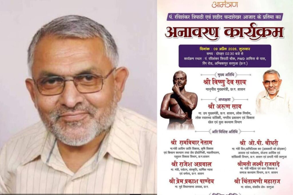अम्बिकापुर (सरगुजा)। भटगांव विधानसभा क्षेत्र के पूर्व विधायक स्वर्गीय पं. रविशंकर त्रिपाठी एवं अमर क्रांतिकारी शहीद चन्द्रशेखर आजाद की प्रतिमाओं का अनावरण आज 9 अप्रैल 2026, गुरुवार को अम्बिकापुर भटगांव में भव्य कार्यक्रम के साथ किया जाएगा। यह आयोजन पं. रविशंकर त्रिपाठी चौक, पीडब्ल्यूडी ऑफिस के पास, रिंग रोड पर दोपहर 2:30 बजे से प्रारंभ होगा।