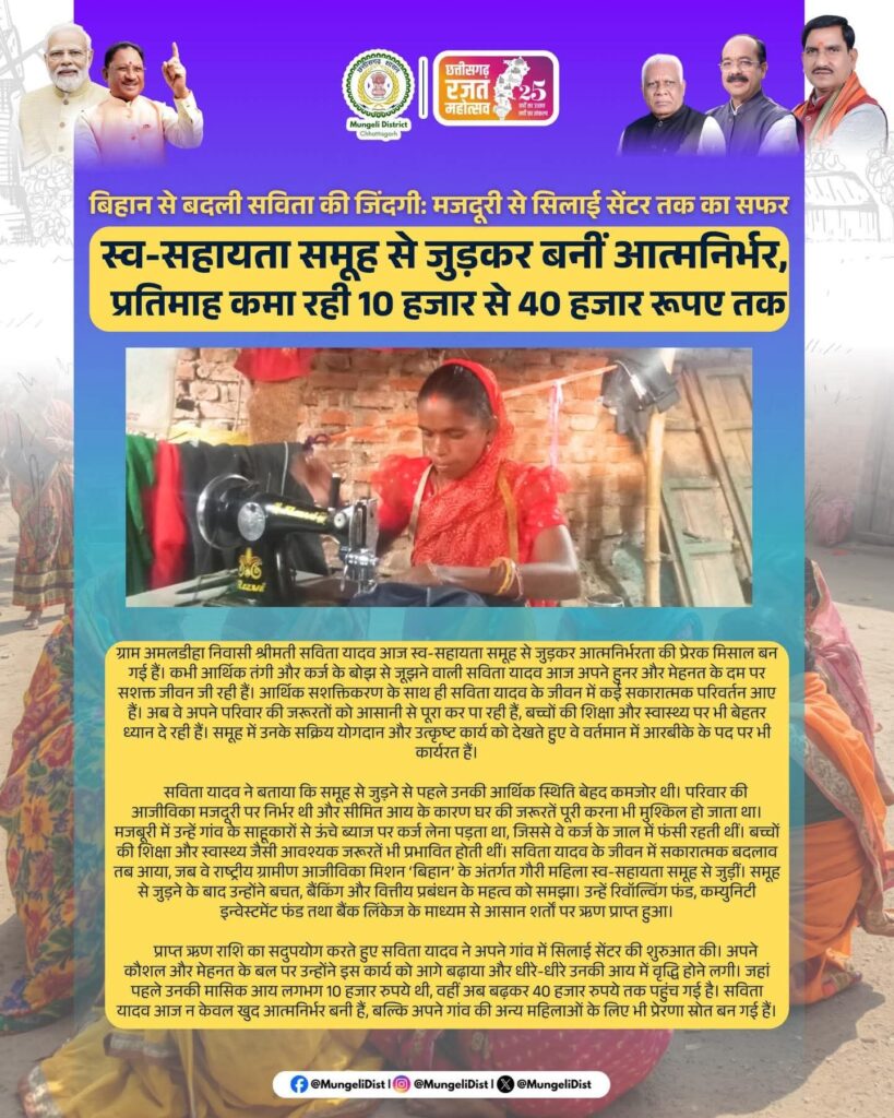 मुंगेली जिला। मेहनत, लगन और सही मार्गदर्शन से जिंदगी कैसे बदल सकती है, इसका उदाहरण हैं सविता, जिन्होंने कभी मजदूरी कर अपने परिवार का भरण-पोषण किया, लेकिन आज वे एक सफल सिलाई सेंटर संचालक बनकर आत्मनिर्भर जीवन जी रही हैं।