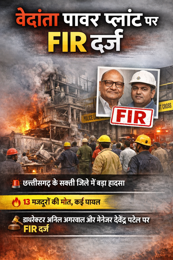 उक्त परिस्थितियों के आधार पर पुलिस अधीक्षक श्री प्रफुल्ल ठाकुर( भारतीय पुलिस सेवा) के निर्देश पर वेदांता कंपनी के निदेशक अनिल अग्रवाल, कंपनी प्रबंधक देवेन्द्र पटेल सहित अन्य जिम्मेदार अधिकारियों और कर्मचारियों के प्रथम दृष्टया लापरवाही परिलक्षित होने पर थाना डभरा में अपराध क्रमांक 119/2026, धारा 106(1), 289, 3(5) बीएनएस के तहत प्रकरण पंजीबद्ध कर विवेचना प्रारंभ कर दी गई है।