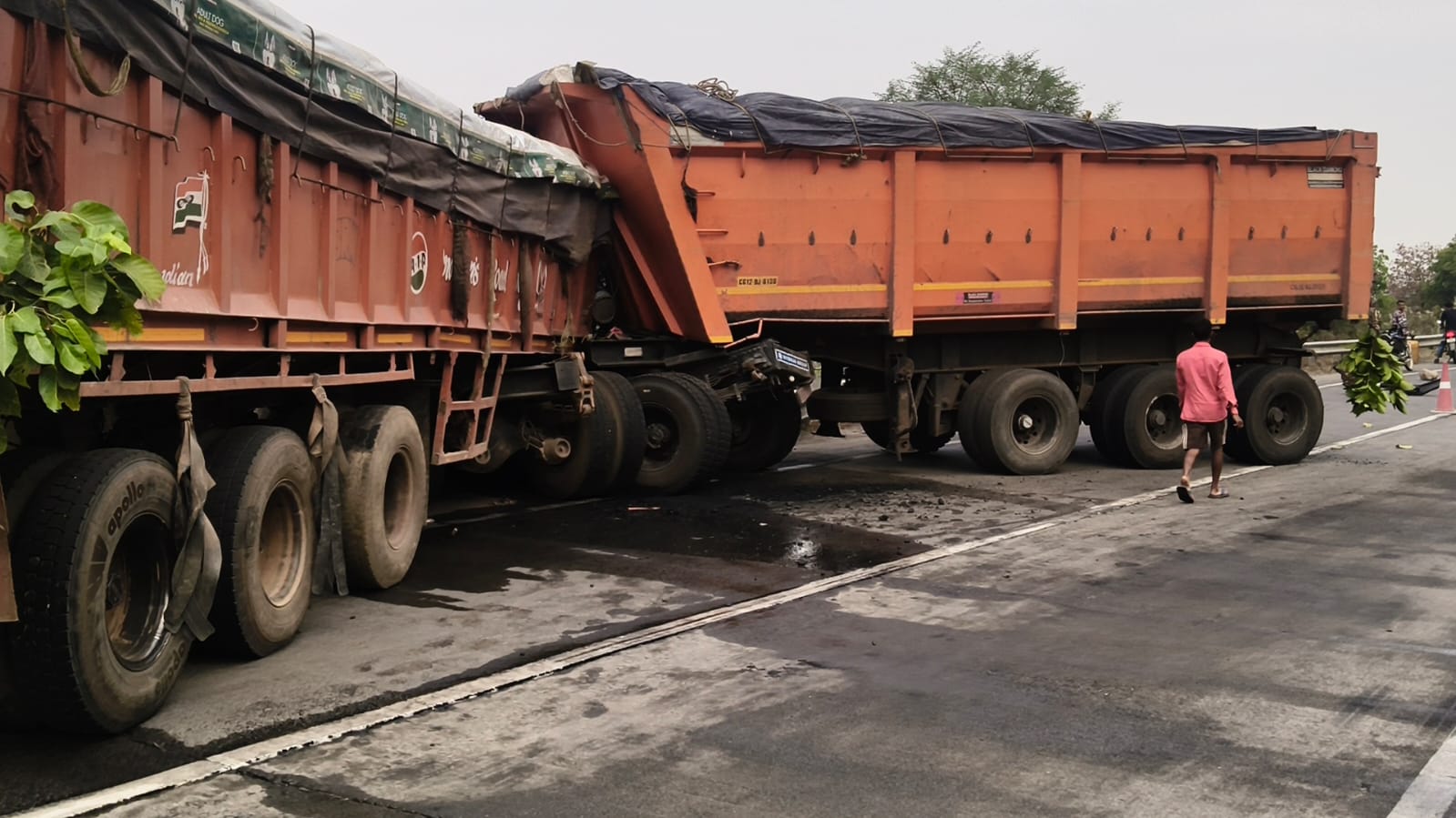 दुर्घटना मे दो ट्रेलर आपस में टकराए,  एक ट्रेलर ने सामने से आ रही कार को मारी जोरदार टक्कर, कार बुरी तरह क्षतिग्रस्त