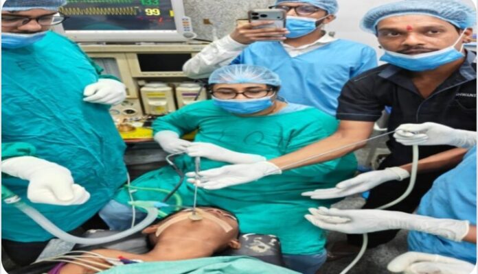 जानकारी के अनुसार, चिरमिरी जिले के धवलपुर निवासी 5 वर्षीय नितिन सिंह सोमवार शाम खेलते-खेलते 5 रुपये का सिक्का निगल गया। सिक्का उसके गले में श्वसन मार्ग के पास फंस गया, जिससे उसे सांस लेने में गंभीर परेशानी होने लगी। परिजन तुरंत उसे सिम्स लेकर पहुंचे, जहां उसकी गंभीर हालत को देखते हुए डॉक्टरों ने बिना देर किए इलाज शुरू किया।