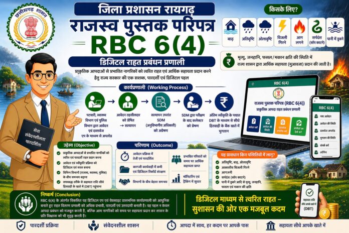 रायगढ़, 28 अप्रैल 2026। जिला प्रशासन रायगढ़ द्वारा प्राकृतिक आपदाओं से प्रभावित नागरिकों को त्वरित, पारदर्शी एवं प्रभावी राहत उपलब्ध कराने के उद्देश्य से ‘राजस्व पुस्तक परिपत्र (RBC 6(4))’ के अंतर्गत एक आनलाइन पोर्टल विकसित किया गया है। यह पहल राज्य शासन की प्राथमिकताओं के अनुरूप प्रशासनिक प्रक्रियाओं को आधुनिक तकनीक से जोड़ते हुए सुशासन को सशक्त बनाने की दिशा में एक महत्वपूर्ण कदम है। इसके तहत बाढ़, अतिवृष्टि, ओलावृष्टि, आकाशीय बिजली गिरने, आगजनी, सर्पदंश तथा पानी में डूबने जैसी घटनाओं में प्रभावित नागरिकों को अब शीघ्र आर्थिक सहायता प्रदान की जा सकेगी। पूर्व में जहां राहत प्रक्रिया में अधिक समय और कागजी औपचारिकताएं बाधा बनती थीं, वहीं अब डिजिटल प्लेटफॉर्म के माध्यम से यह पूरी प्रक्रिया अधिक सरल, पारदर्शी और समयबद्ध हो गई है।