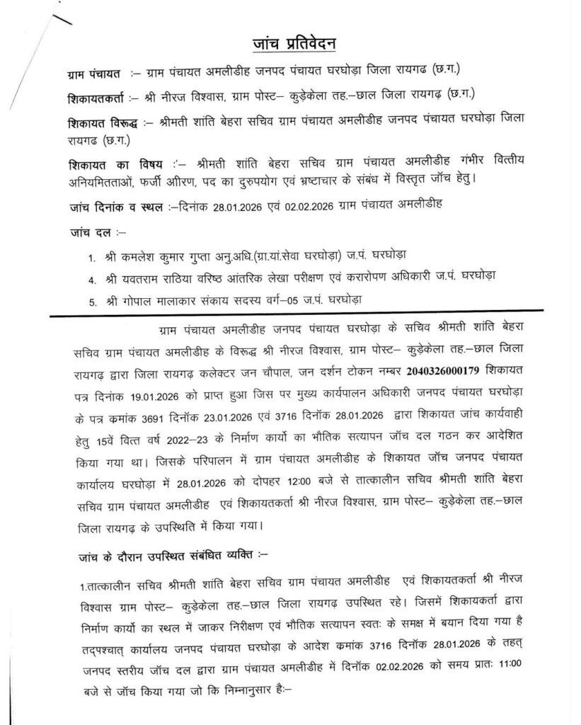 घरघोड़ा। सरकारी कामकाज में पारदर्शिता का नया मॉडल सामने आया है जहां फाइलें चलती भी हैं और पहुंचती भी नहीं! ग्राम पंचायत अमलीडीह के कथित भ्रष्टाचार मामले में जांच रिपोर्ट अब प्रशासनिक रहस्य बन चुकी है, जिसे हर विभाग अपने-अपने तरीके से देख रहा है या शायद नहीं भी देख रहा।